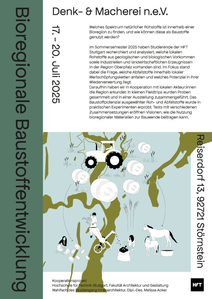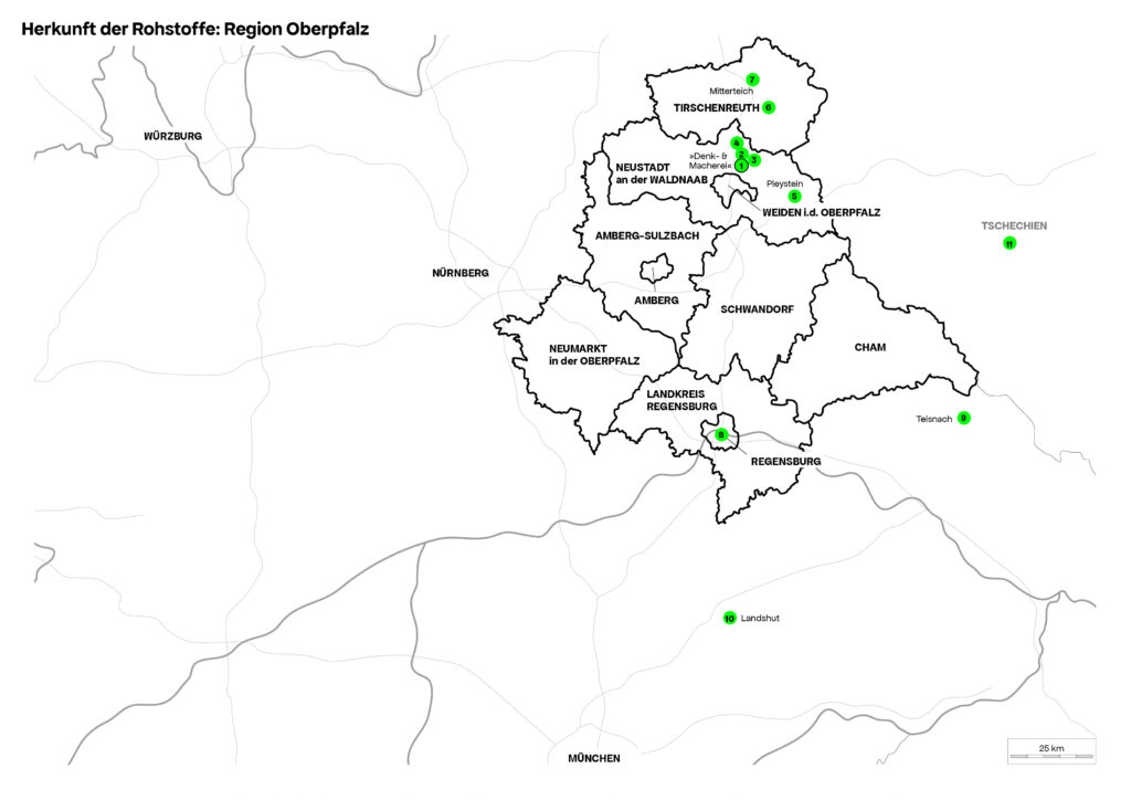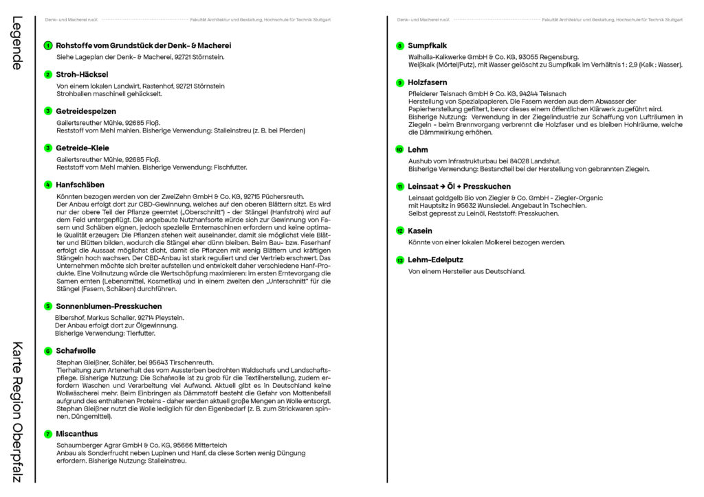 Im Sommersemester 2025 haben Studierende der HFT Stuttgart recherchiert und analysiert, welche lokalen Rohstoffe aus geologischen und biologischen Vorkommen sowie industriellen und landwirtschaftlichen Erzeugnissen in der Region Oberpfalz vorhanden sind. Im Fokus stand dabei die Frage, welche Abfallstoffe innerhalb lokaler Wertschöpfungsketten anfallen und welches Potenzial in ihrer Wiederverwertung liegt.