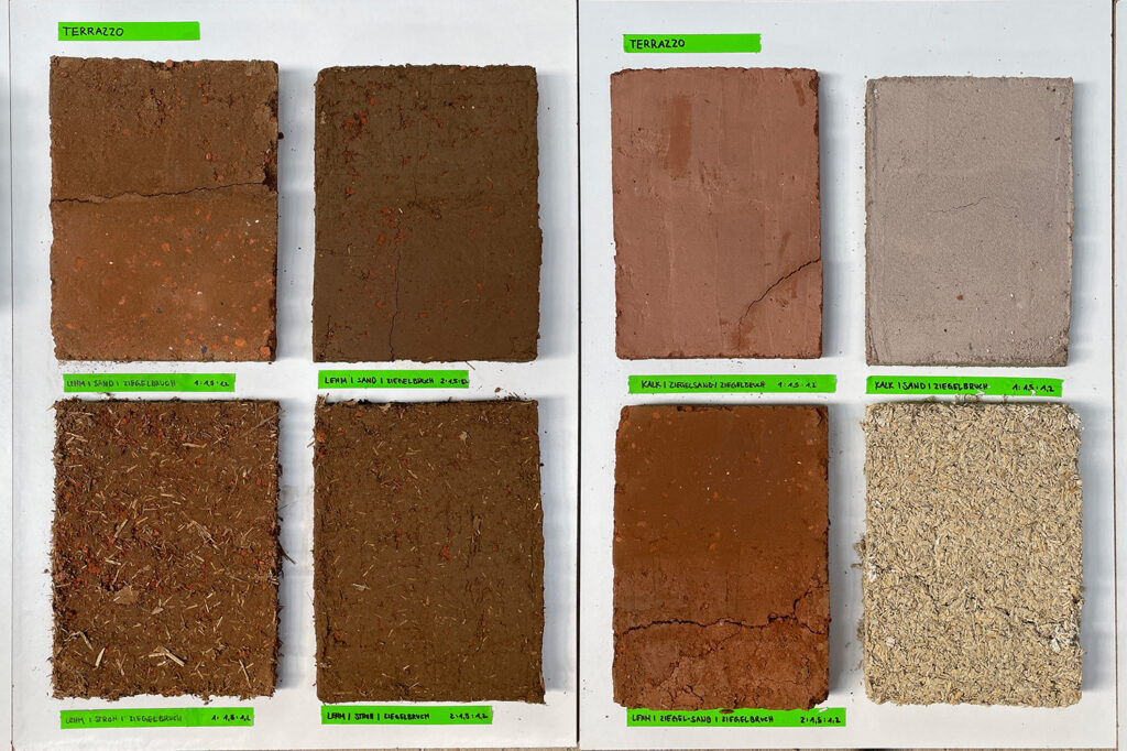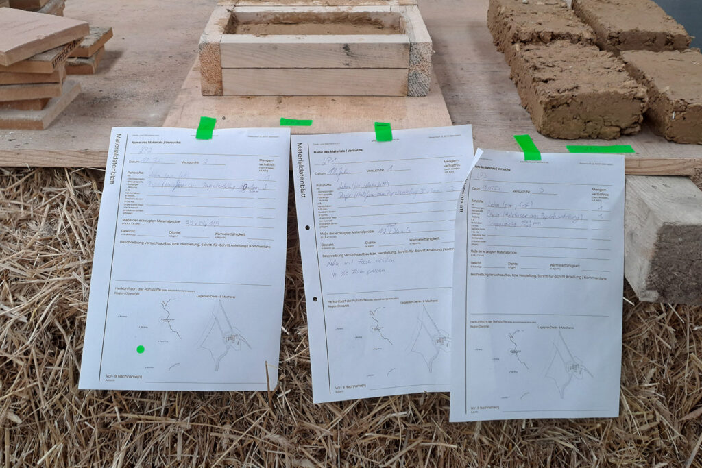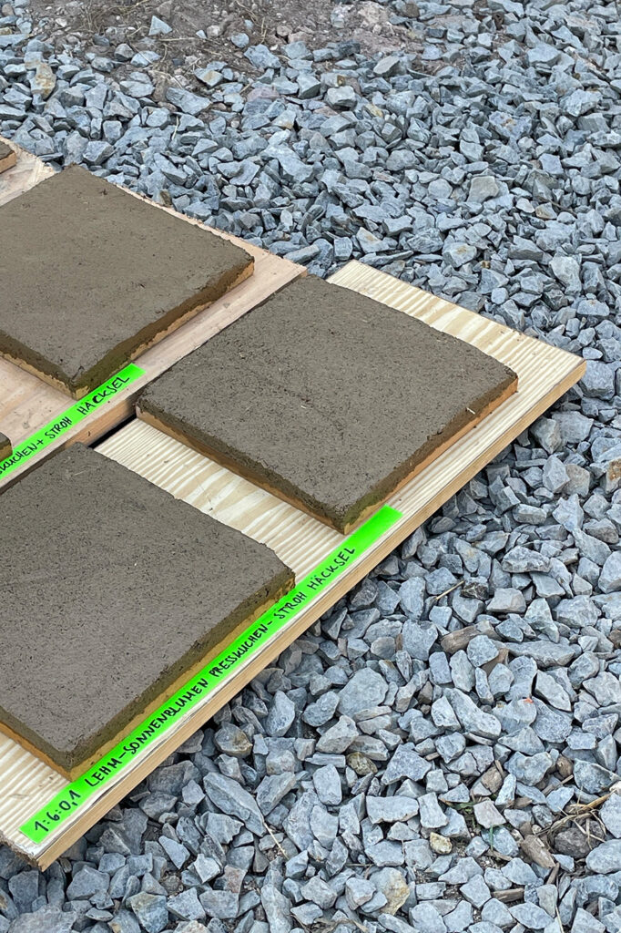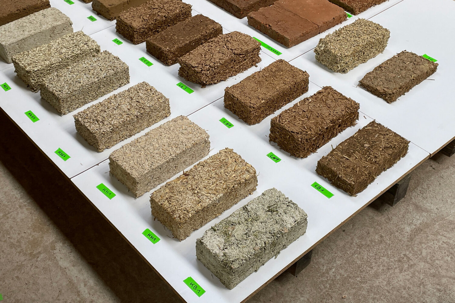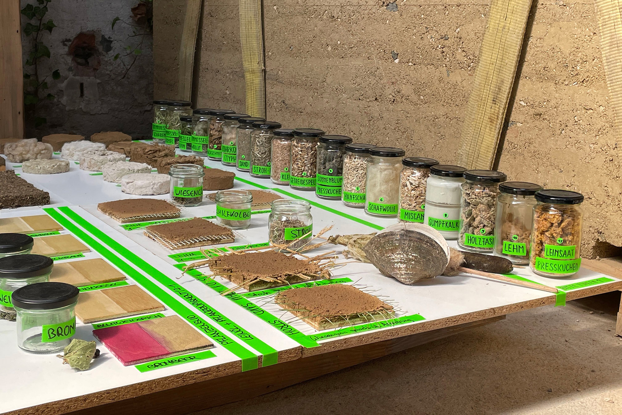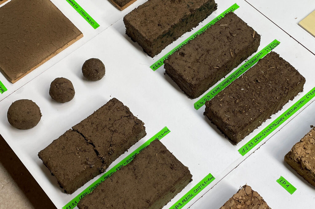 Daraufhin haben wir in Kooperation mit lokalen Akteur:innen die Region erkundet: In kleinen Fieldtrips wurden Proben gesammelt und in einer Ausstellung zusammengeführt. Das Baustoffpotenzial ausgewählter Roh- und Abfallstoffe wurde in praktischen Experimenten erprobt. Tests mit verschiedenen Zusammensetzungen eröffnen Visionen, wie die Nutzung bioregionaler Materialien zur Bauwende beitragen kann.