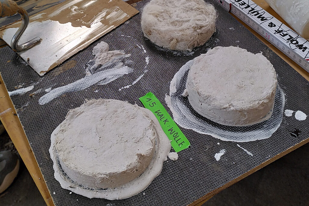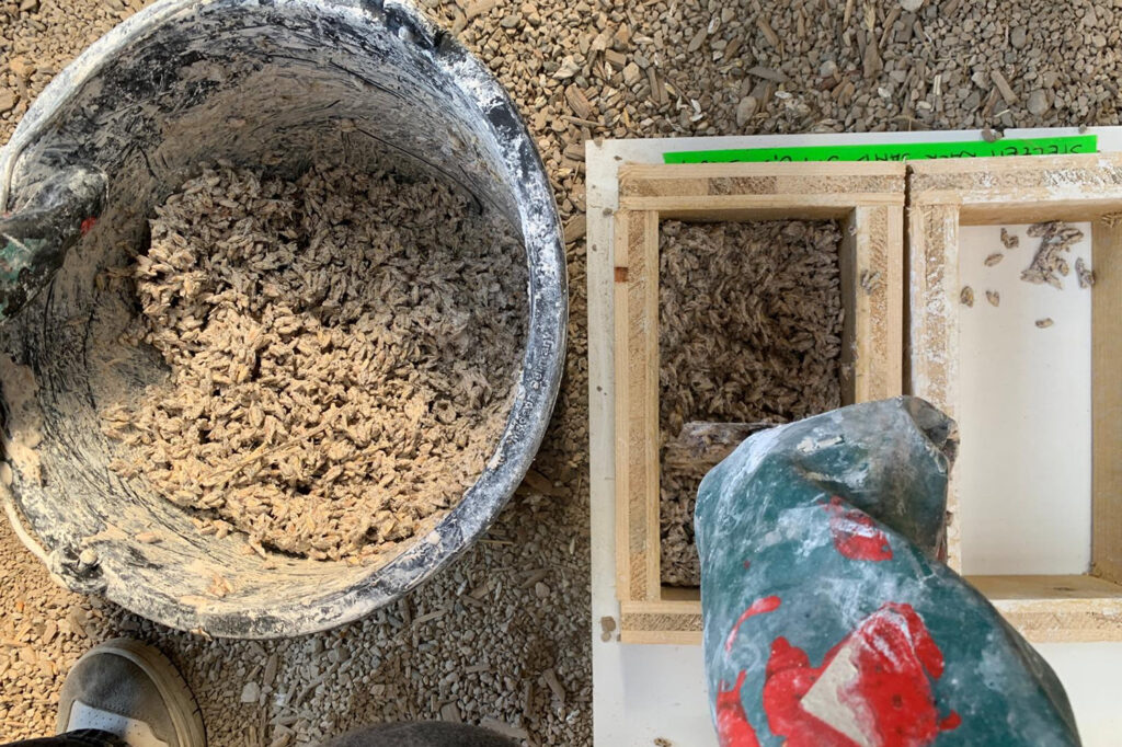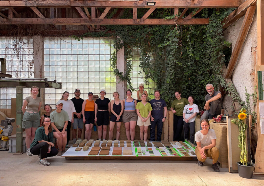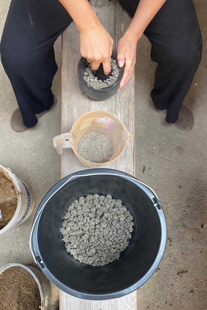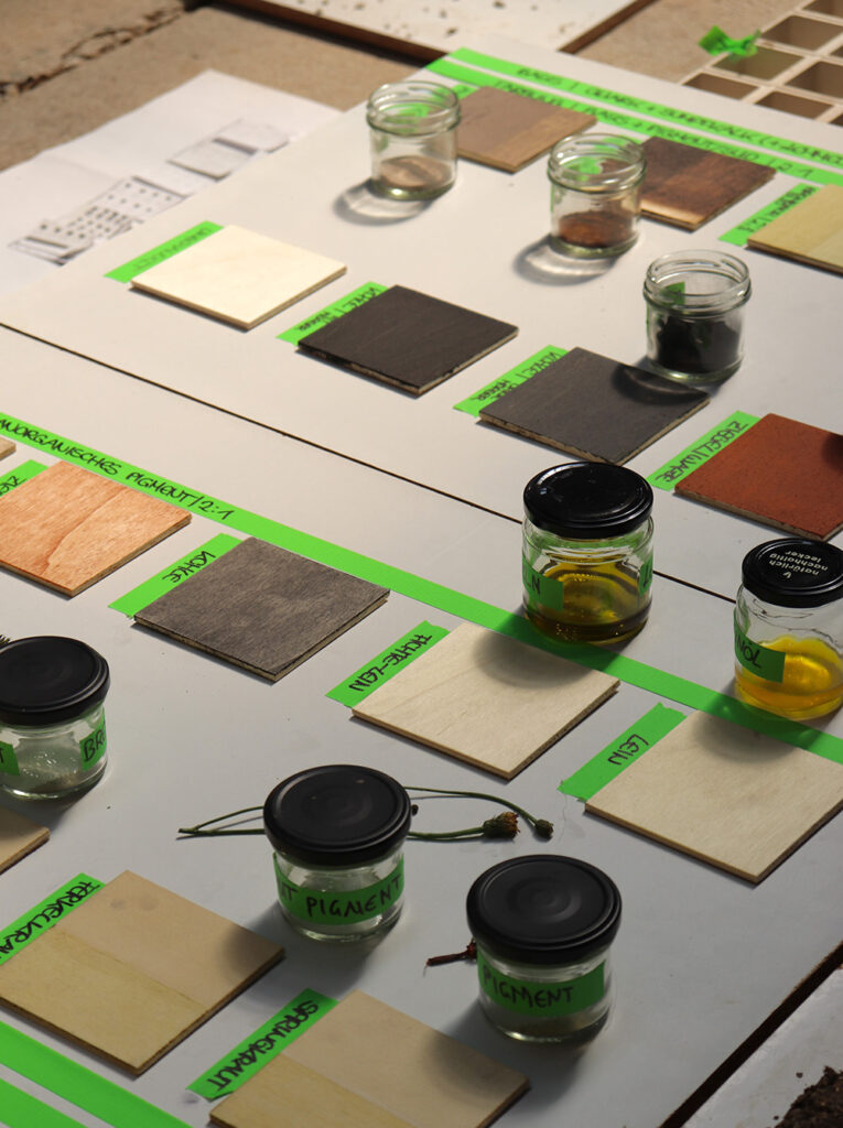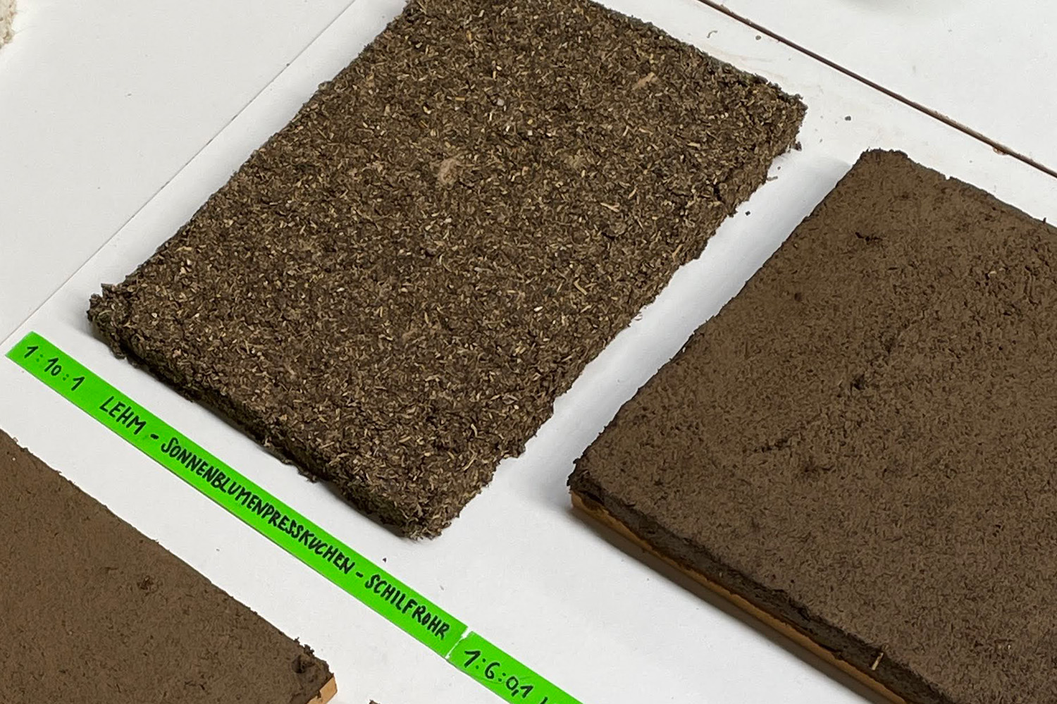 Daraufhin haben wir in Kooperation mit lokalen Akteur:innen die Region erkundet: In kleinen Fieldtrips wurden Proben gesammelt und in einer Ausstellung zusammengeführt. Das Baustoffpotenzial ausgewählter Roh- und Abfallstoffe wurde in praktischen Experimenten erprobt. Tests mit verschiedenen Zusammensetzungen eröffnen Visionen, wie die Nutzung bioregionaler Materialien zur Bauwende beitragen kann.
